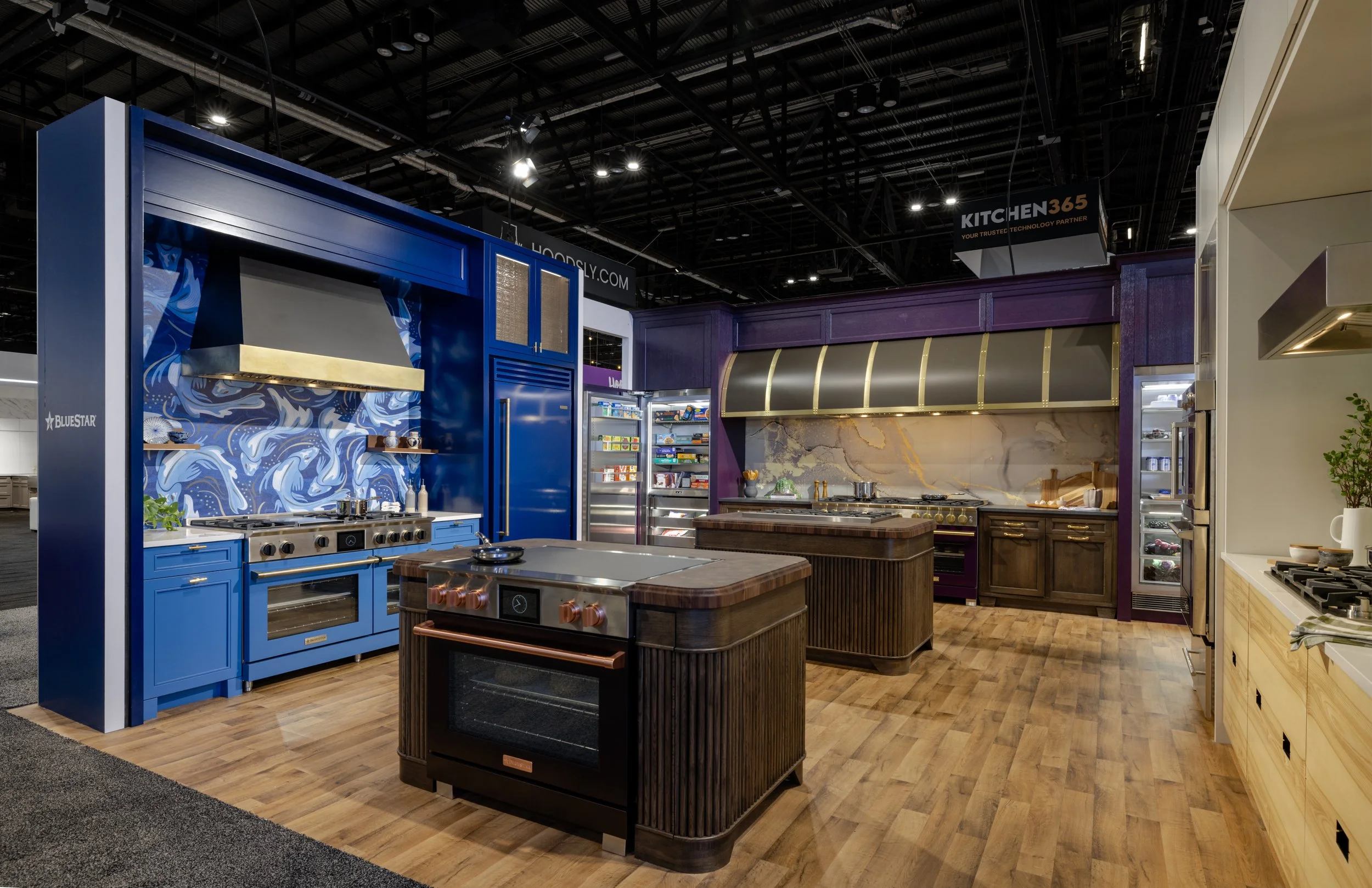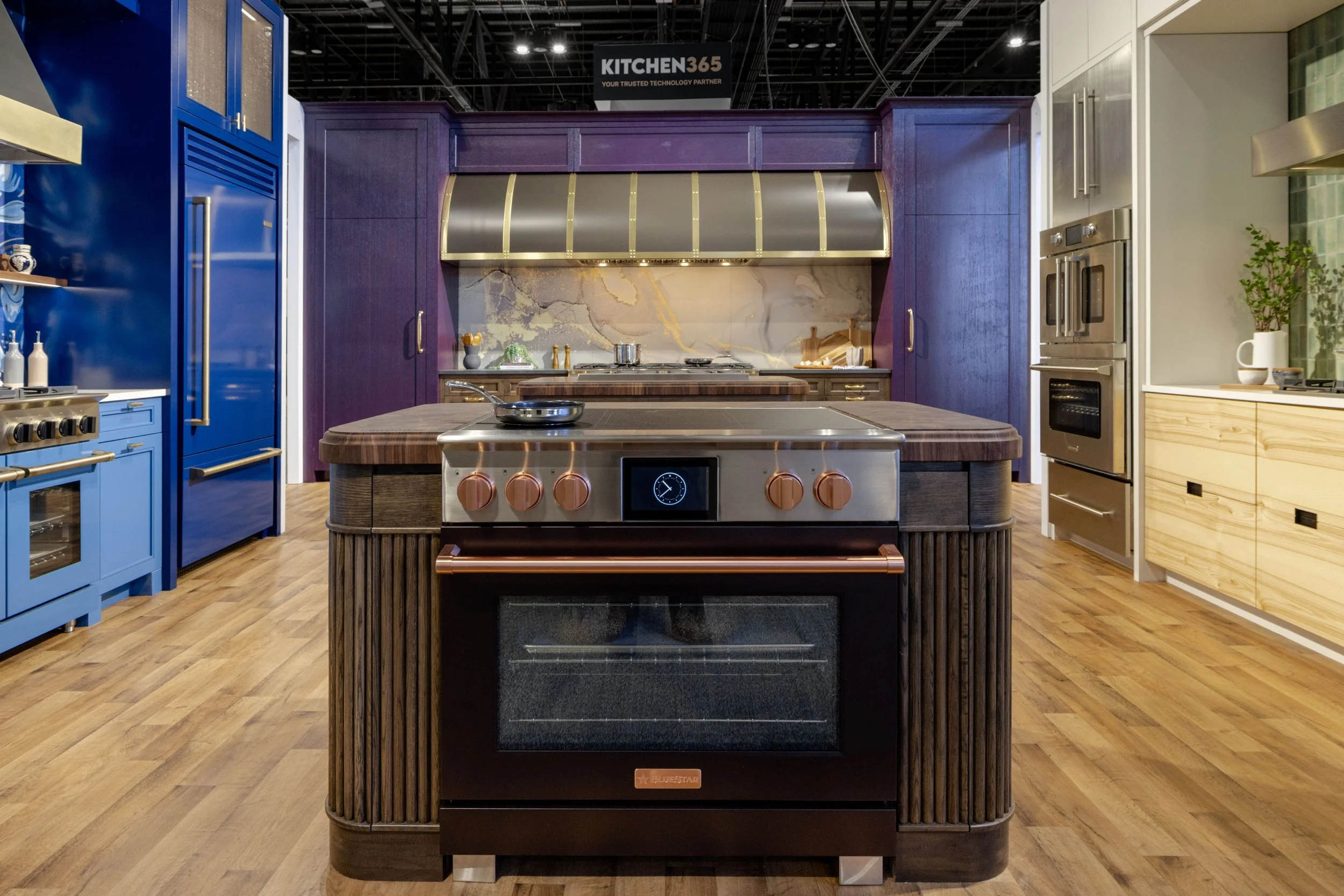A bold blue Koi mural anchors the vignette, creating a visual midpoint between the rustic Swiss-inspired space and the dramatic Color of the Year destination towards the back of the booth. While still approachable, this vignette introduces a more elevated design language through color, finish, and composition. BlueStar’s 48” Dual Fuel Range is featured here in Brilliant Blue, accented with antique brass and matte black knobs, with a Normandy Hood above. A BlueStar Pro French Door Built-In Refrigerator in deep Cobalt Blue complements the mural’s layered blue tones.