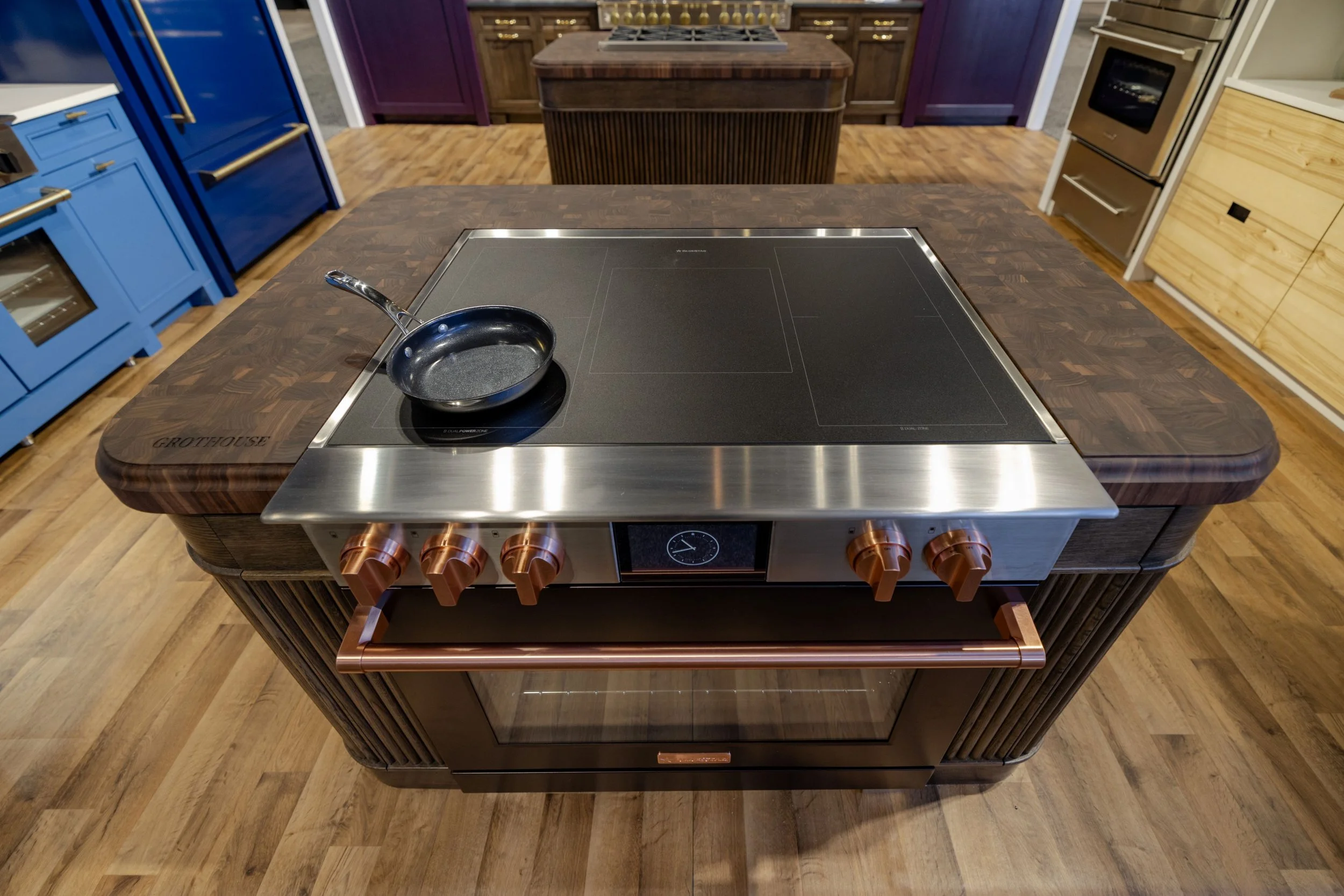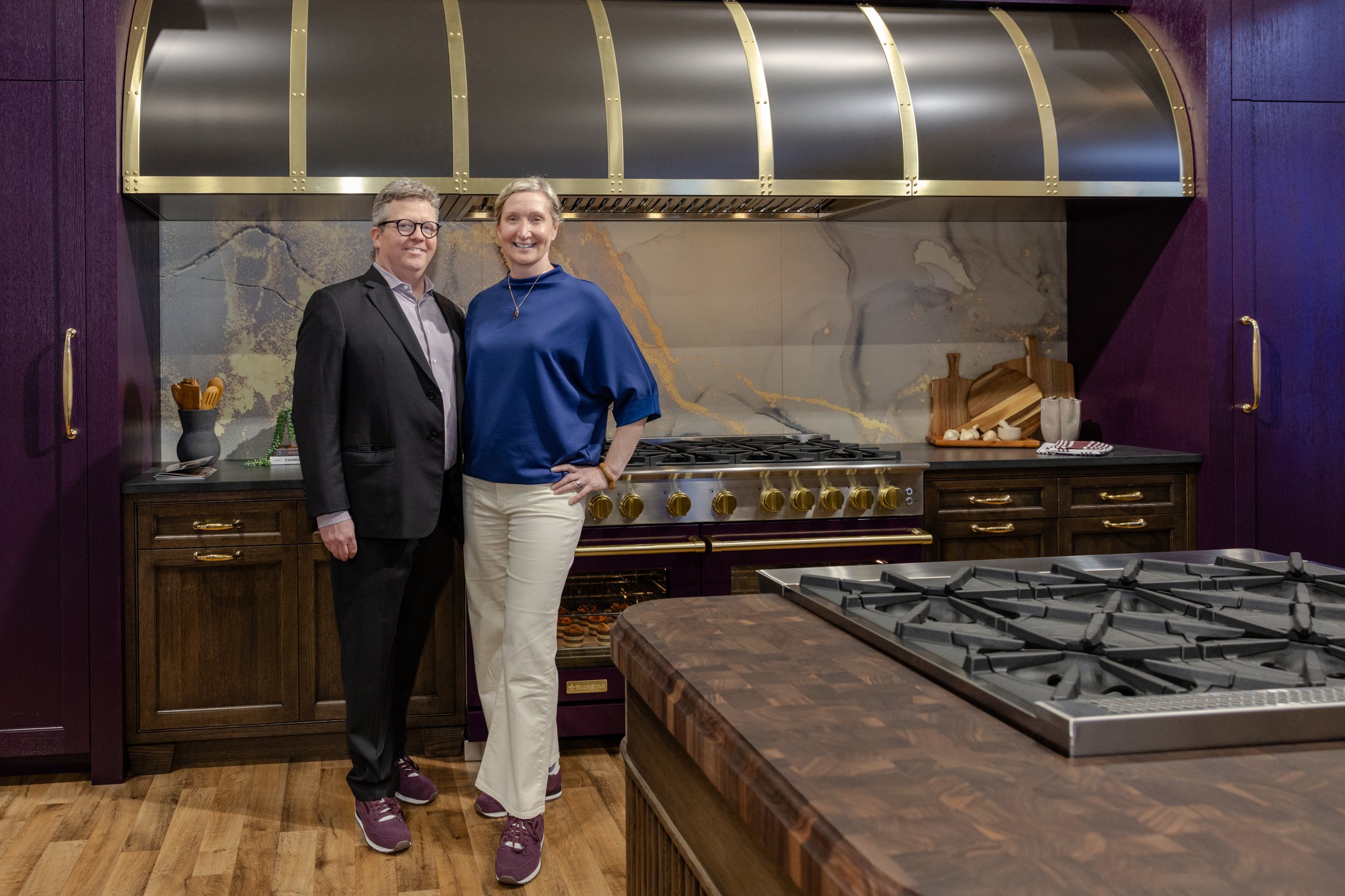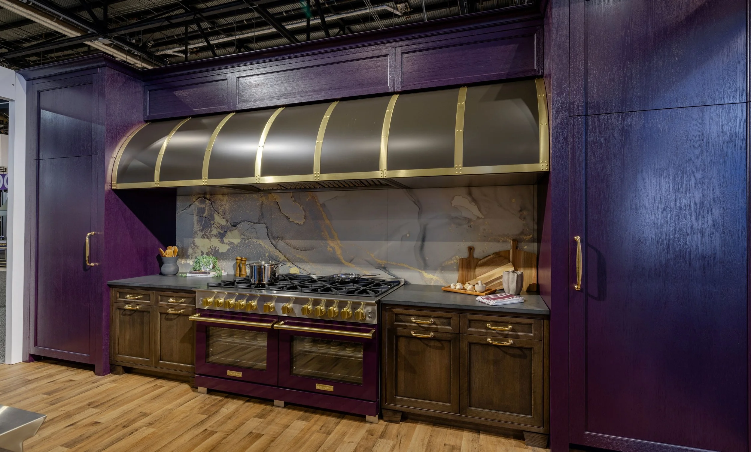 Anchoring the booth at the back wall, the Color of the Year vignette serves as the emotional and visual crescendo of the space. Designed as the ultimate destination, it envelops visitors in depth, warmth, and material richness. Purple Violet is a bold yet inviting hue, chosen by the Shumaker’s for its richness without feeling exclusive. At the center of the vignette is a 60” Platinum Series Range in Purple Violet, framed by cabinetry stained in the Color of the Year to create a dramatic focal point that elevates the range as the heart of the kitchen. Village Handcrafted aniline dye cabinetry surrounds the space, with stained Rift White Oak base cabinets grounding the composition. A custom 143” Atlas Hood in a statuary bronze finish with brushed brass strapping centers the vignette. Its extended length mirrors the cabinetry, reinforcing symmetry and drawing the eye to the range. Together, the layered materials and finishes create a bold yet welcoming environment that unifies the booth and brings the Shumaker’s vision to life.