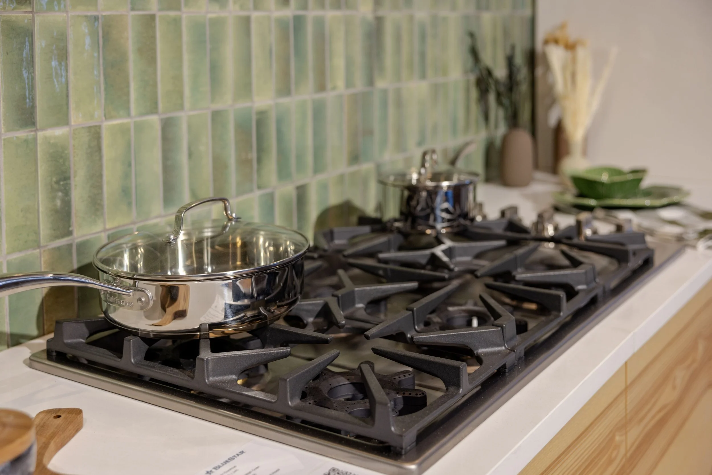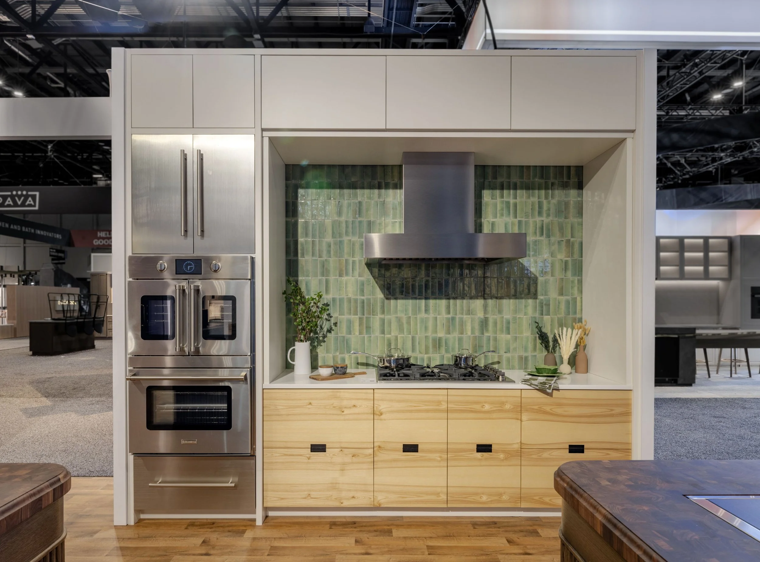 The East vignette, designed by Shumaker Design, is one of the most utilitarian and approachable spaces in the booth. Inspired by mountain homes and alpine retreats, it draws on Swiss vernacular architecture, seamlessly blending centuries-old materials with modern living. The result is a kitchen that feels grounded, warm, and genuinely livable. This vignette showcases one of BlueStar’s latest innovations, the X-8™ Cooktop, and Manhattan Hood paired with a stainless-steel French Door Double Wall Oven. Countertops by Onur Marble & Granite reflect light across a green tile backsplash inspired by traditional ceramic-tiled Swiss stoves. Cabinetry by Village Handcrafted throughout, features high-gloss white uppers to reflect light and complement the stone surfaces, which are paired with White Ash base cabinets that reference old-world Alpine construction and exposed ceiling beams.